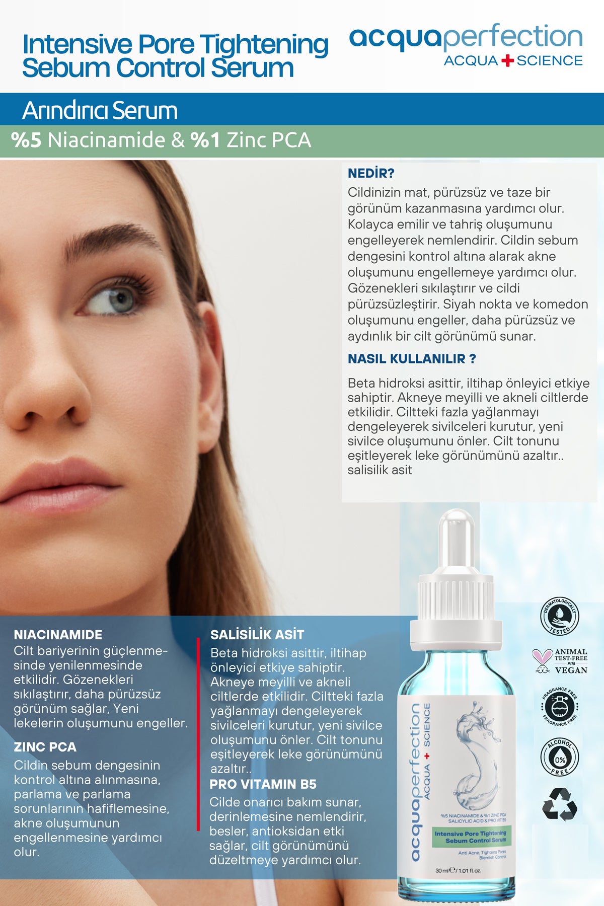 Yağlı ve akneye eğilimli ciltler için özel olarak formüle edilmiş , Siyah Nokta ve Gözenek Karşıtı Sebum Bakım Serumu, %5 niacinamide ve %1 çinko içeriği ile cildin yağ dengesini koruyarak ve siyah nokta oluşumunu azaltmaya yardımcı olur.